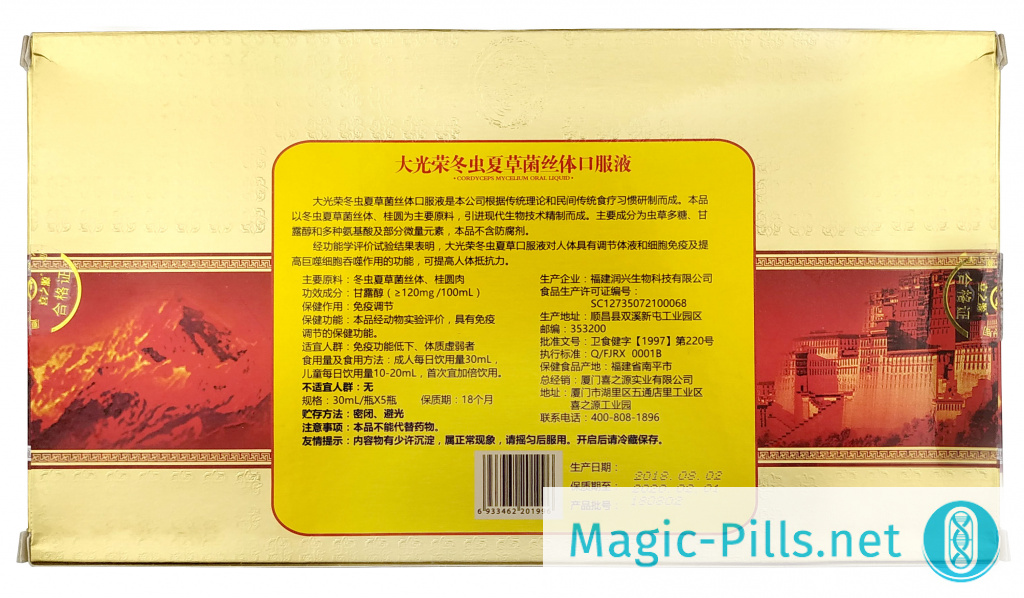 Как правило, в первую очередь БАД Cordyceps Mycelium Oral Liquid позиционируют как эффективнейшее средство восстанавливающее и укрепляющее иммунитет и устраняющее расстройства метаболизма. Но этим перечень полезных воздействий Мицелия Кордицепса Китайского на организм не ограничивается.