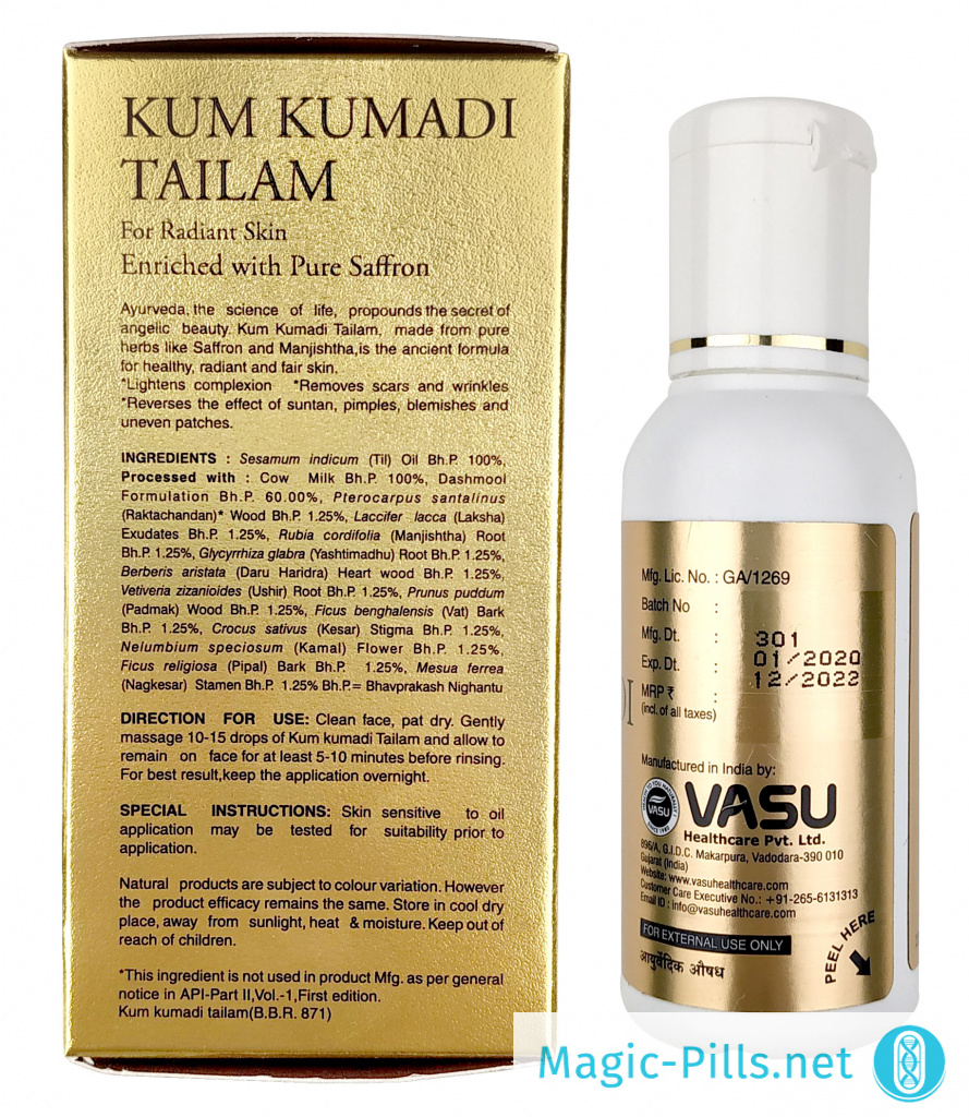 Для лечения и профилактики проблем с кожей лица и шеей необходимо разобраться лишь с тем, где купить Kumkumadi Vasu. Аюрведическое масло из Индии продается через интернет, что существенно упрощает его покупку. Онлайн заказ в нашей аптеке быстро проходит обработку, и товар направляется получатель в Москве или в любой другой регион страны.