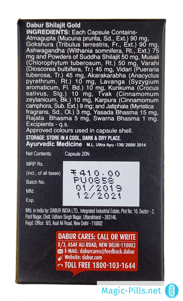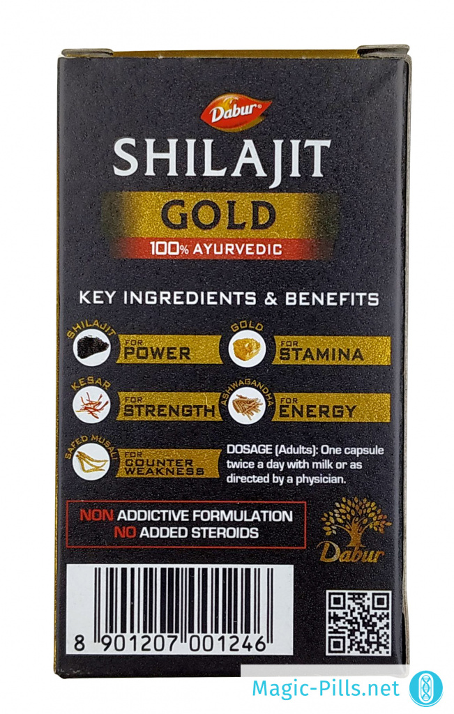 Капсулы Шиладжит Голд Дабур отличает уникальный состав, включающий гималайское мумие, золотой порошок, растительные экстракты из корицы, шафрана, Gokhshru Ashwagandha. В комплексе все ингредиенты работают в едином тандеме, направленном на укрепление здоровье и восстановление сил: