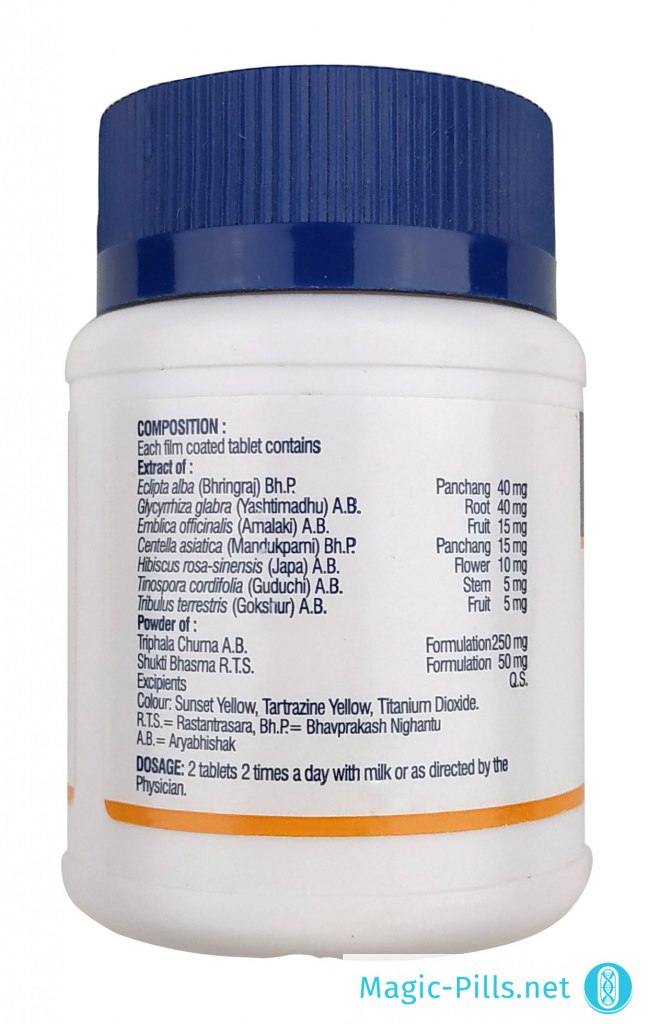 В состав обсуждаемого препарата входят исключительно натуральные (природные) компоненты, в частности, экстракты целебных трав (к примеру, Брами, Брингараджа, Амалаки, Солодки голой, Гибискуса, Розы китайской, Лакрицы, Гокшуры, Гудучи).