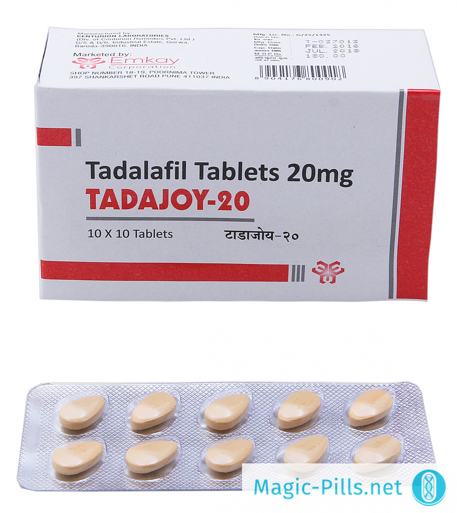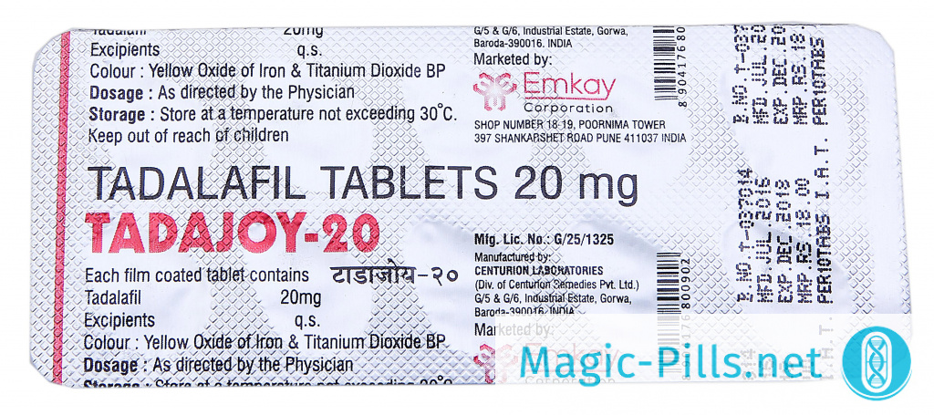 Tadajoy 20 mg – один из популярных препаратов на основе Тадалафила (дженериков Сиалиса). Это средство для регуляции потенции производится в Индии небольшой фармацевтической корпорацией Emkay. Из-за того, что компания не распыляется на множество препаратов, ее представители уделяют огромное внимание качеству выпускаемых лекарственных средств. Еще совсем недавно купить Tadajoy 20 mg можно было лишь в Москве, сейчас же препарат доступен жителям любой точки России и стран СНГ.