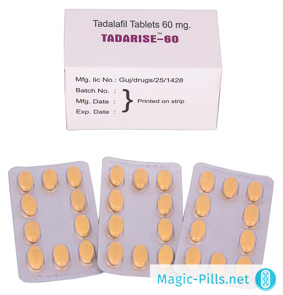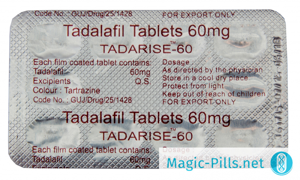 В таблетках Тадарайз 60 мг - тройное содержание Тадалафила. Благодаря особенным добавкам производителя, препарат с повышенным составом Тадалафила становится эффективнее и безопаснее, чем оригинал. Медицинские научно-исследовательские разработки производителя из Индии не останавливаются на достигнутом результате, а постоянно развиваются и совершенствуются. В итоге – современный супер эффективный препарат для повышения потенции с увеличенной дозировкой, вызывающей стойкую эрекцию. Несмотря на то, что рекомендованной дозой оригинала Сиалиса считается дозировка 20 мг Тадалафила, Тадарайз 60 мг с повышенной концентрацией считается приемлемым для разового приема. Купить Tadarise 60 mg рекомендовано тем мужчинам, которых не устраивает меньший состав главного компонента. Таблетка для усиления потенции желтого цвета начинает действовать по истечении 30 минут после приема. Не стоит бояться неконтролируемой или неуместной потенции. Стойкая эрекция появится только при наличии источника "вдохновения".
