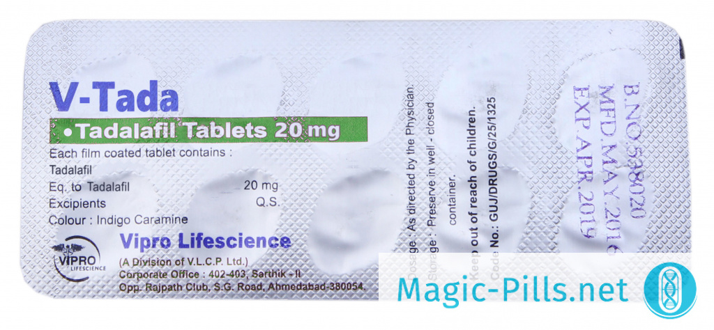 V-Tada Super 20 mg – это классическая дозировка одного из лучших регуляторов потенции. Об этом дженерике Сиалиса отлично рассказывает его название. “V” – это инициал производителя – надежной фармацевтической компании Vipro LifeScience. “Tada” – это сокращение основного действующего вещества препарата – Тадалафила. А «Super» в названии говорит о пролонгированном действии этого регулятора потенции. Итак, V-Tada Super 20 mg – это Тадалафил, разработанный индийской компанией Vipro LifeScience по специальной формуле, которая обеспечивает максимально долгий эффект при приеме стандартной дозировки в 20 мг.