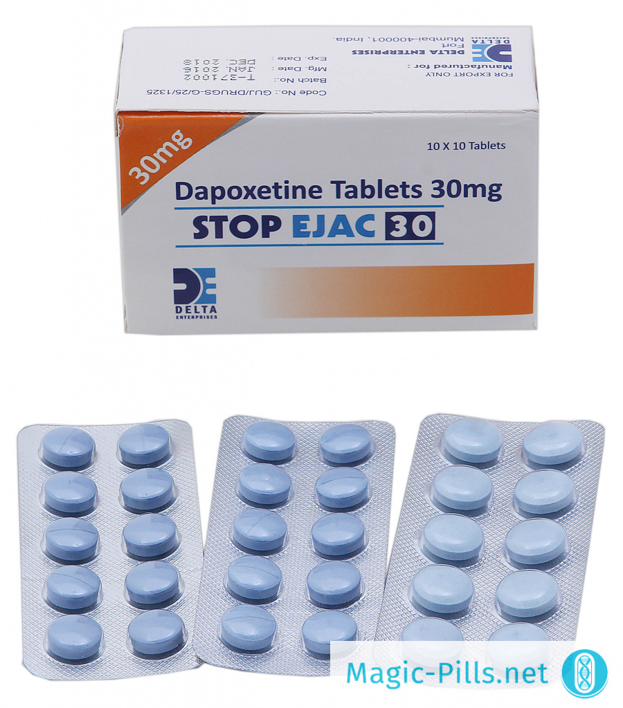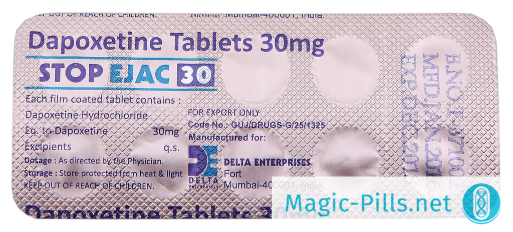 Stop Ejac 30 mg (Стоп Эяк 30 мг) – это препарат для избавления от преждевременного семяизвержение. Название препарата говорит само за себя, поскольку Stop Ejac можно перевести не иначе как «остановить эякуляцию». Дозировка 30 мг создана специально для здоровых мужчин, которые хотят увеличить продолжительность полового акта до 20-30 минут. Также Stop Ejac 30 mg отлично подойдет мужчинам с начальной стадией преждевременной эякуляции.