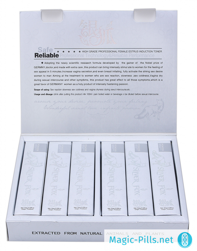 Каждому мужчине хоть раз в жизни встречались девушки, поведение которых не оправдывало надежд и оказанного внимания. Такие девушки с легкостью принимают подарки, с удовольствием ходят в кафе и рестораны за наш счет, но когда настает «момент истины» придумывают сотни причин, чтобы отказать. Так проходят дни, а за днями недели и месяцы, а мы не получаем ничего кроме убытков и «интересного общения». Специально для таких случаев и придуман препарат Серебряная лиса (Silver Fox), мгновенное возбуждающее действие которого отложит все 100 причин на второй план.