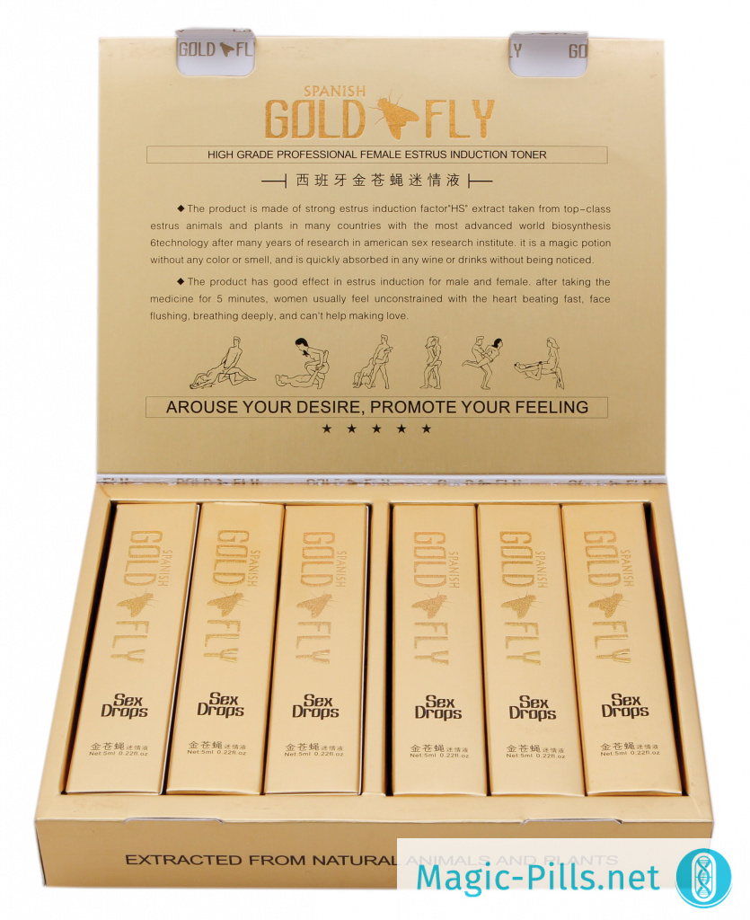 В англоговорящих странах найти и купить Шпанскую мушку можно только под названием Spanish Gold Fly (пер. испанская золотая муха). Такое название препарата связано прямую со Шпанской мушкой лишь частично. Добавление «Gold» - это не больше, чем просто название бренда, которое стало именем нарицательным для всех афродизиаков на основе Кантаридина. Обращаем ваше внимание, что в магазине Magic Pills вы можете купить именно Spanish Gold Fly, а не его аналог и, уж тем более, подделку.