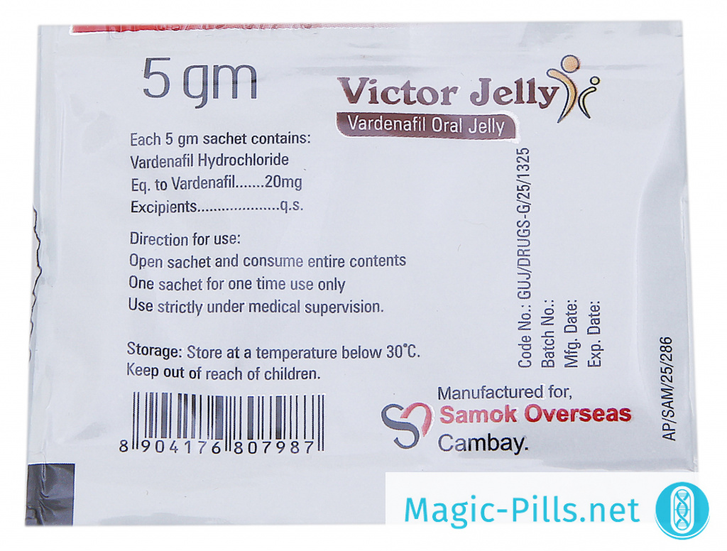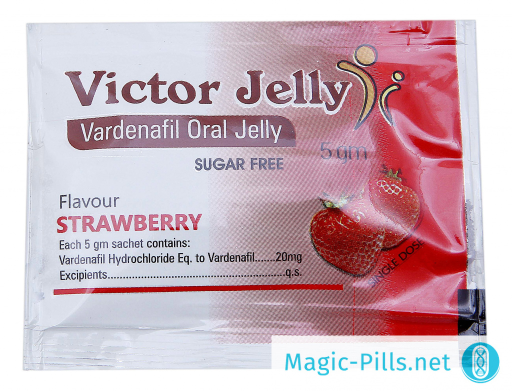 Victor Oral Jelly – это регулятор потенции в форме геля (или как его называют в англоязычных странах желе), основанный на Варденафиле. Желе Виктор обладает рядом преимуществ перед своими таблетированными «братьями», главными из которых являются более высокая скорость действия (45 минут против 60) и отсутствие необходимости в каких-либо дополнительных средствах для приема (гель не требует запивания водой). Так что если вы решите купить Victor Oral Jelly, вы сможете принимать его абсолютно незаметно практически в любой момент.