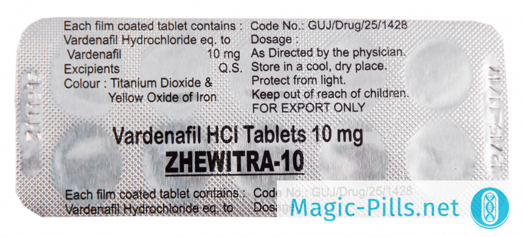 Наряду с известными оригинальными препаратами для усиления мужской потенции имеется много улучшенных форм медикаментозных средств, именуемых дженериками. К таким препаратам относится Zhewitra 10 мг, функционирующая на основе славноизвестной Левитры. В основе ее действия заложено то же активное действующее вещество, что и в оригинале - Варденафил. Благодаря действию Варденафила, расширяются кровеносные сосуды пениса, принимая большее количество крови. Ускорение кровяного потока приводит к возникновению твердой эрекции, чего и желают добиться мужчины.