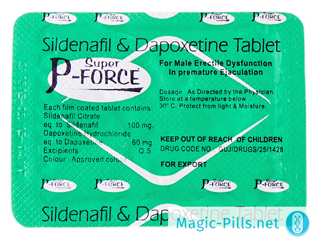 Препарат Super P-Force объединяет в себе два мощных компонента: действующее вещество легендарной Виагры Силденафил и один из самых знаменитых пролонгаторов1 Дапоксетин. Первый, как легко можно догадаться, ответственен непосредственно за эрекцию. Его действие основано на расширении тканей половых органов и усилении к ним притока крови. Силденафил в Супер П-Форсе содержится в классической дозировке 100 мг, которая эффективно нейтрализует симптомы средней и тяжелой стадий эректильной дисфункции. Второй компонент нужен для нейтрализации симптомов преждевременной эякуляции. Благодаря его уникальному воздействию на центральную нервную систему, мозг определенное время после начала полового акта просто не может подать сигнал к оргазму, отсрочивая его на необходимое время. Дапоксетин в Супер П-Форсе тоже добавлен в своей классической дозировке 60 мг.