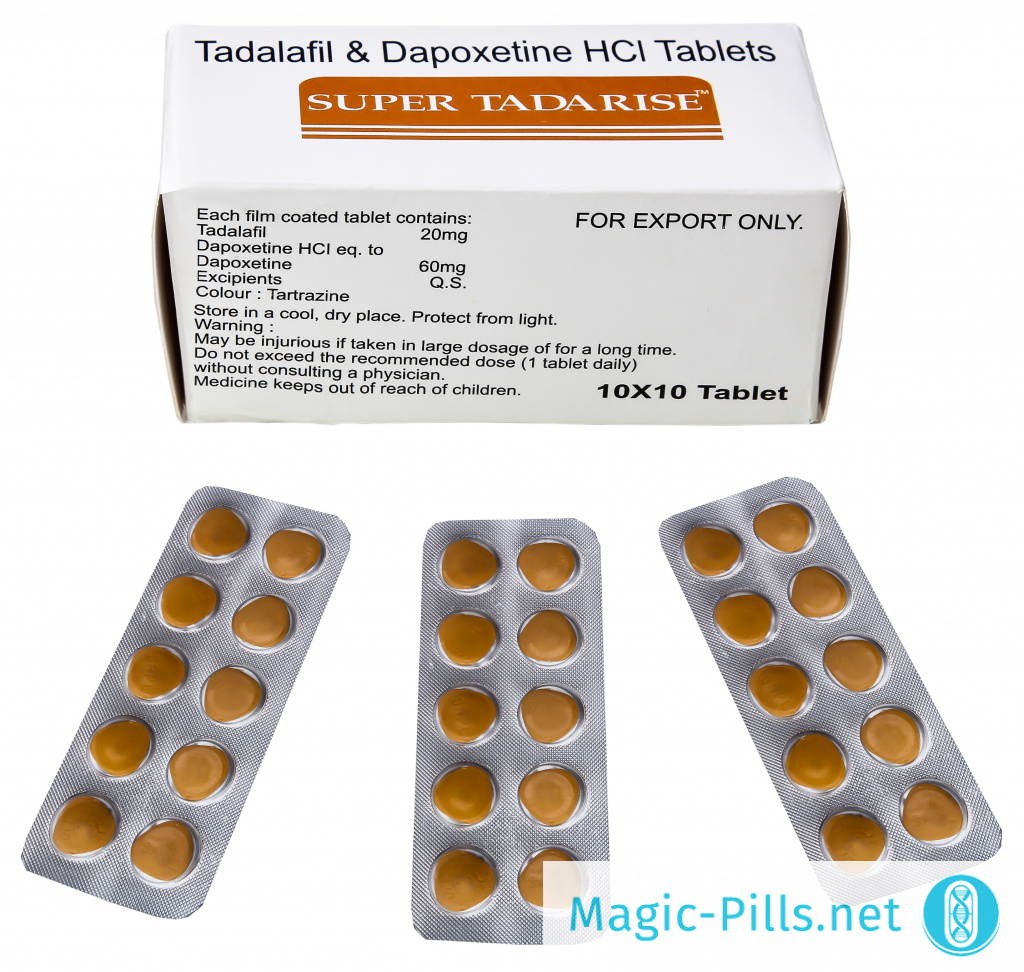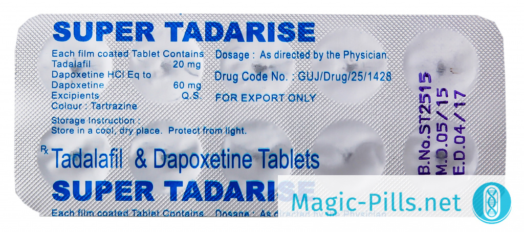 Super Tadarise (Супер Тадарайз) – это комбинированный препарат для мужчин, который сочетает в себе регулятор потенции Тадалафил и пролонгатор1 Дапоксетин. Эти компоненты по отдельности являются самыми популярными лекарственными средствами в своих сферах и уже успели доказать эффективность миллионам мужчин. Тадалафил и Дапоксетин отлично сочетаются при совместном приеме и не вызывают конфликта, тем не менее производители Super Tadarise фармацевтическая компания Sunrise Remedies немного изменили формулы этих компонентов, чтобы поднять показатель совместимости еще выше. Это гарантирует, что и эректильный, и пролонгирующий эффекты будут раскрыты в полной мере.
