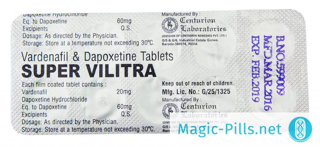 Необходимо понимать, что Super Vilitra и Виагра - это препараты, несколько схожие по своему предназначению, однако они отличаются по своему качественному и количественному составу. Виагра - это Силденафил, который предназначен для улучшения эрекции (как уже было указано выше — он далеко не всегда эффективен), а Супер Вилитра - единственное лекарственное средство среди аналогов, состав которого включает комбинацию Варденафила и Дапоксетина, что позволяет не только обеспечить возможность полового акта, но и сделать его более продолжительным, доставляя, таким образом, незабываемые ощущения мужчине и его избраннице. Не зависимо от того, где вы живете: в огромной Москве или маленьком Арзамасе, купить Super Vilitra в Magic Pills можно без рецепта лечащего врача. При условии использования согласно инструкции препарат безопасен для здоровья - так что прежде, чем купить Супер Вилитру, необходимо ознакомиться с правилами применения.