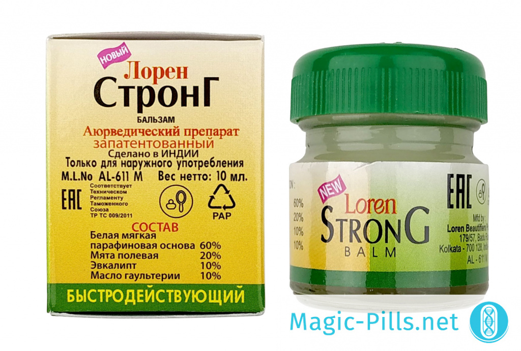 Содержание в составе биоактивных эфирных масел позволяет использовать мазь Loren Strong Balm для борьбы с симптомами простуды и гриппа. Средство хорошо прогревает мышцы, улучшает кровообращение, устраняет ломоту в теле, помогает снять отёчность носовых ходов и облегчить дыхание. Бальзам помогает справиться с головной болью напряжения, облегчить тяжесть после тяжелого и беспокойного дня.