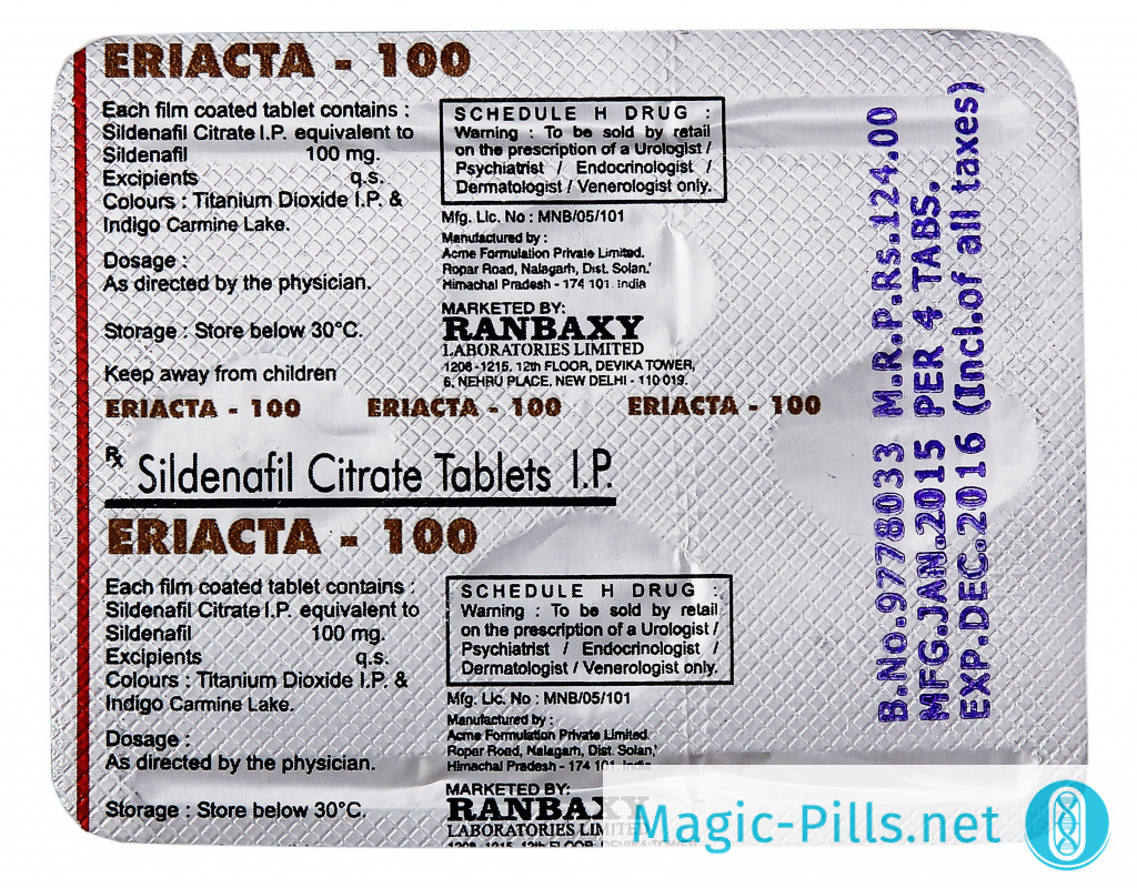 Eriacta 100 mg - это дженерик известного препарата Виагра. Его действующим компонентом является Силденафил. Это вещество селективно ингибирует фосфодиэстеразу1, посредством чего обеспечивается достаточный приток крови к половым органам мужчины. Кровообращение в половом члене становится усиленным, что приведет к эрекции. Важным свойством препарата для лечения эректильной дисфункции является то, что без источника возбуждения эрекция наступить не может, поэтому мужчине не стоит опасаться за конфузные ситуации непредвиденной эрекции.