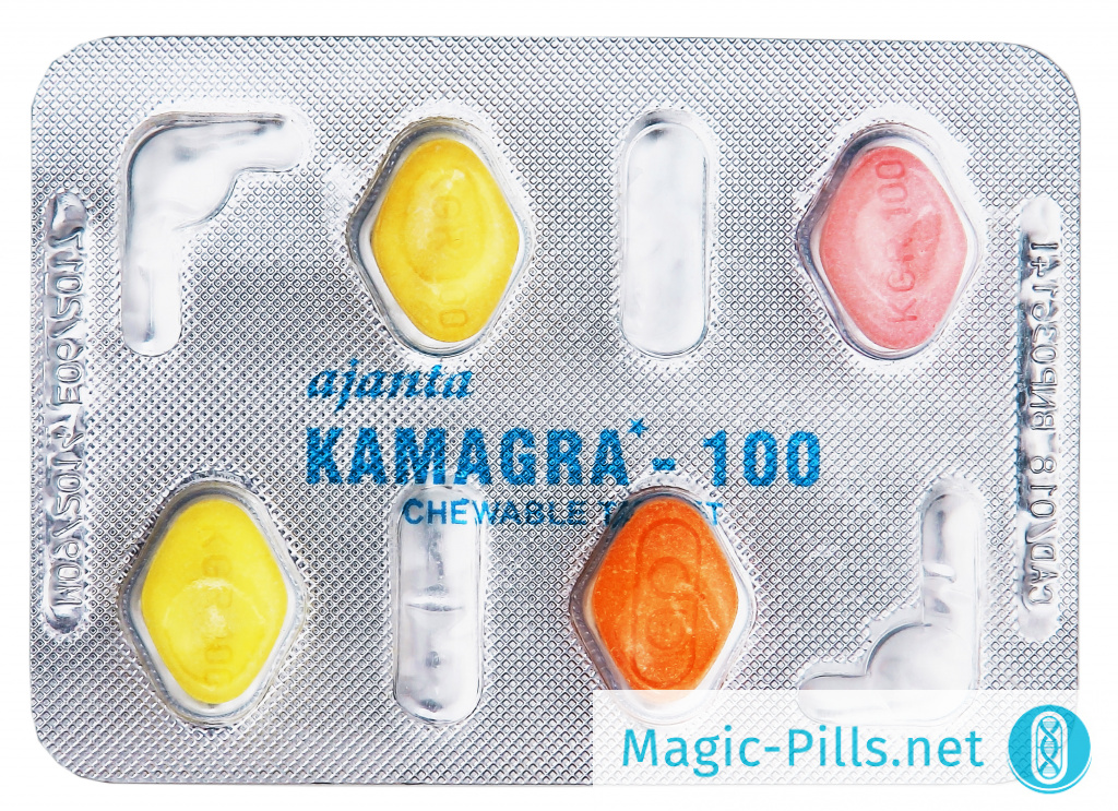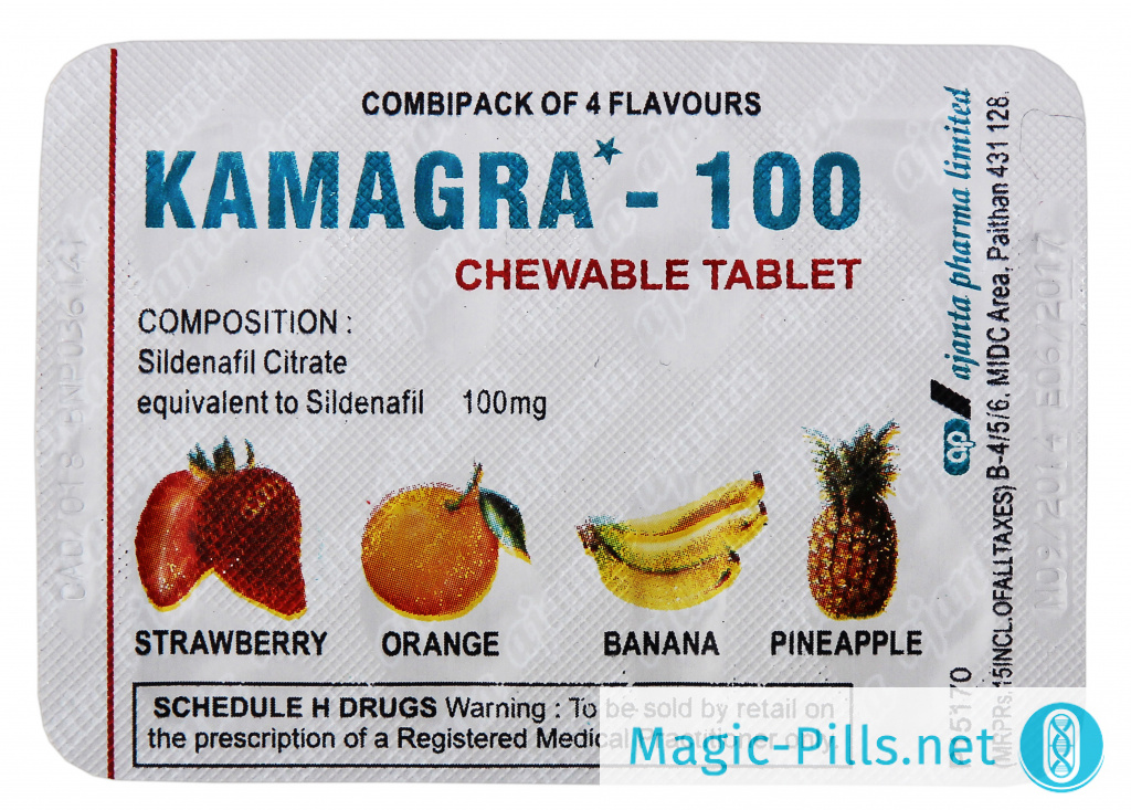 По своему действию Kamagra Chewable 100 mg ни в чем не уступает Виагре с составом Силденафила 100 мг. Особенные добавки индийского производителя сделали этот препарат еще более действенным и удобным для применения. Одна из 4-х таблеток блистера с ананасовым, апельсиновым, клубничным, банановым вкусом обеспечит быстрый и стабильный эффект. Таблетку с приятным вкусом не надо запивать водой, она рассасывается мужчиной, как конфета. Благодаря этому, можно скрыть от партнерши неуверенность в своих силах.